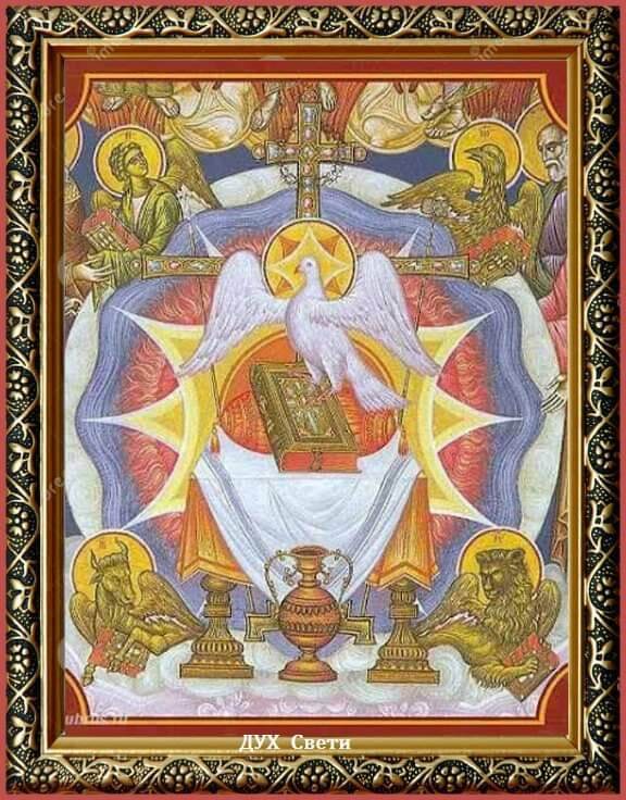 Въ понедѣ́льникъ Пентико́стный, поуче́ніе свята́го Іоа́нна Златоу́стаго о сше́ствіи Свята́го Ду́ха на святы́я Христо́вы ученики́ и апо́столы. Вели́цыи на́мъ, люби́міи, о́тъ Бога да́ны да́рове во дне́шній пра́здникъ. Ве́село да восхва́лимъ Христа́ Бо́га на́шего, се́ бо въ прише́ствіе Свята́го Ду́ха доидо́хомъ. Дне́сь си́лу прія́ша апо́столи и нача́ша глаго́лати инѣ́ми язы́ки, я́ко же Ду́хъ Святы́й подава́ше и́мъ. Почто́ Святы́й Ду́хъ, Отцу́ и Сы́ну Единосу́щенъ сы́й, во о́бразѣ о́гненнѣ яви́ся апо́столомъ, а на Единоча́дѣмъ Сы́нѣ въ голуби́нѣ о́бразѣ яви́ся? Почто́ же иногда́ голуби́нымъ о́бразомъ, а иногда́ о́гненнымъ явля́ется Святы́й Ду́хъ? Ни на́ Господа пріи́де во о́бразѣ о́гненнѣ, ни на ученики́ яви́ся въ голуби́нѣ? Четы́рьми у́бо се́ е́сть раздѣле́ніи: со Отце́мъ и Сы́номъ бѣ́ единовѣ́ченъ Ду́хъ, о́гненымъ о́бразомъ яви́ся апо́столомъ, я́ко безпло́тенъ, неизрече́ненъ и неви́димъ Бо́гъ. Но о́гненъ е́сть, Па́влу свидѣ́тельствующу: «Бо́гъ на́шъ е́сть Огнь пояда́яй»; того́ ра́ди о