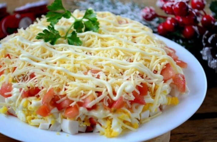Как приготовить слоеный салат с крабовыми палочками и помидорами