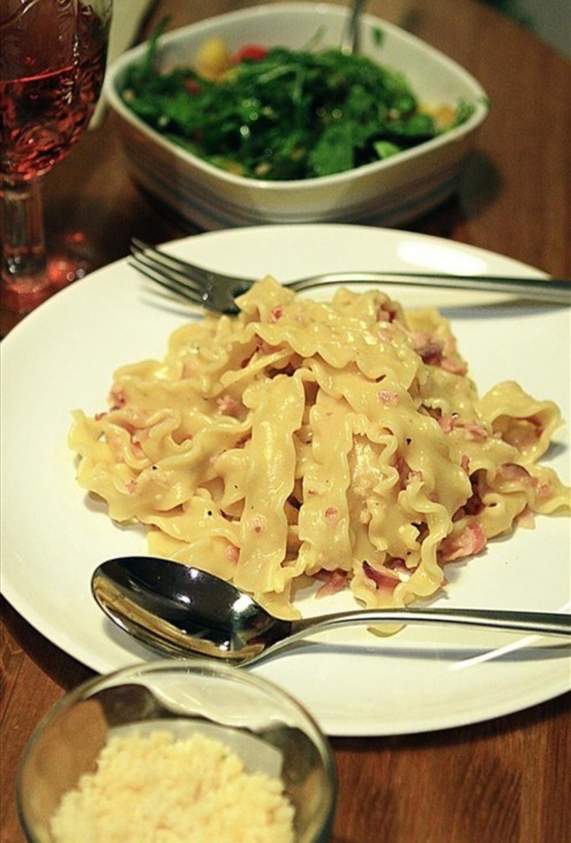 Ингредиенты Спагетти - 125 г Сливочное масло - по вкусу Чеснок - 1 зубчик Красный лук - ½ головки Бекон - 25 г Сливки 20%-ные - 4 столовые ложки Тертый сыр пармезан - 25 г Яйцо куриное - 2 штуки Соль - по вкусу Перец черный молотый - по вкусу Инструкция приготовления 1. Вскипятите воду в большой кастрюле и сварите пасту до состояния аль денте. Обычно для этого нужно варить ее на минуту меньше, чем указано на пачке. 2. Пока паста варится, растопите на сковороде масло и обжарьте на нем мелко нарезанные лук, чеснок и бекон. До мягкости и до отчетливого чесночного и жаренобеконного запаха. 3. Снимите сковороду с огня и в глубокой миске взбейте четыре яичных желтка со сливками и тертым пармезаном. Посолите и поперчите смесь, еще раз взбейте. 4. В готовые спагетти вывалите обжаренные с луком и чесноком кусочки бекона. Влейте смесь сливок, желтков и пармезана, перемешайте. И сразу подавайте, посыпав свеженатертым сыром и черным молотым перцем.
