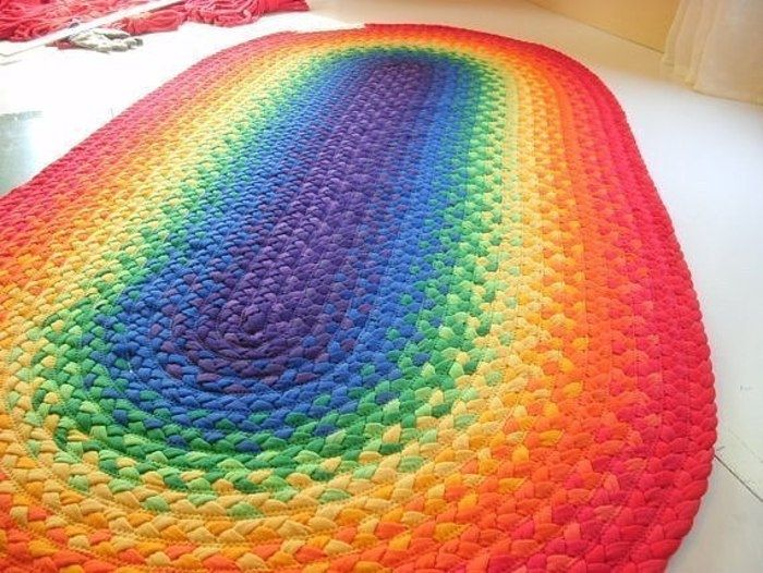 Что делать если в шкафу вы обнаружили много старых футболок которые уже давно не надевали и не планируете? Сделайте коврик для украшения интерьера вашего дома или квартиры. Он хорошо подойдёт как для гостиной, так и для прихожей и ванной. Итак, что же вам понадобится для этого задания? Естественно пара тех самых старых футболок или маек, ножницы и капелька фантазии. Нам придется нарезать бывшую верхнюю одежду на ровные полоски. Учтите, что это долгое занятие, поэтому возьмите хорошо режущие ножницы. Кроме этого, нам понадобится мелок, чтобы начертить ровные полосы шириной три сантиметра. Так вам будет легче сделать работу красиво и аккуратно. Взгляните на фотографии. Коврики отличаются друг от друга и если вам по душе второй вариант, то после обрезки постирайте полосы. Когда они высохнут, то сами закрутятся в трубочки. Основа ковра Просто так сделать коврик не получится. Ему нужна основа. Для этого возьмите сетку (такую, чтобы выдержала стирку и не одну) которую можно купить в стро