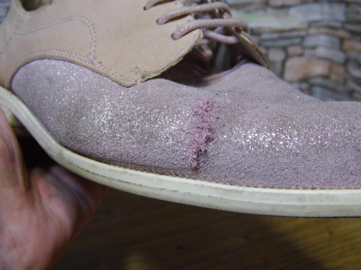 Это разрыв сбоку. Материал - спилок с покрытием. Скорее всего, обо что-то зацепились. Про спилок статья уже была - материал вообще без механической прочности. Была бы гладкая кожа - скорее всего бы даже не заметили.
