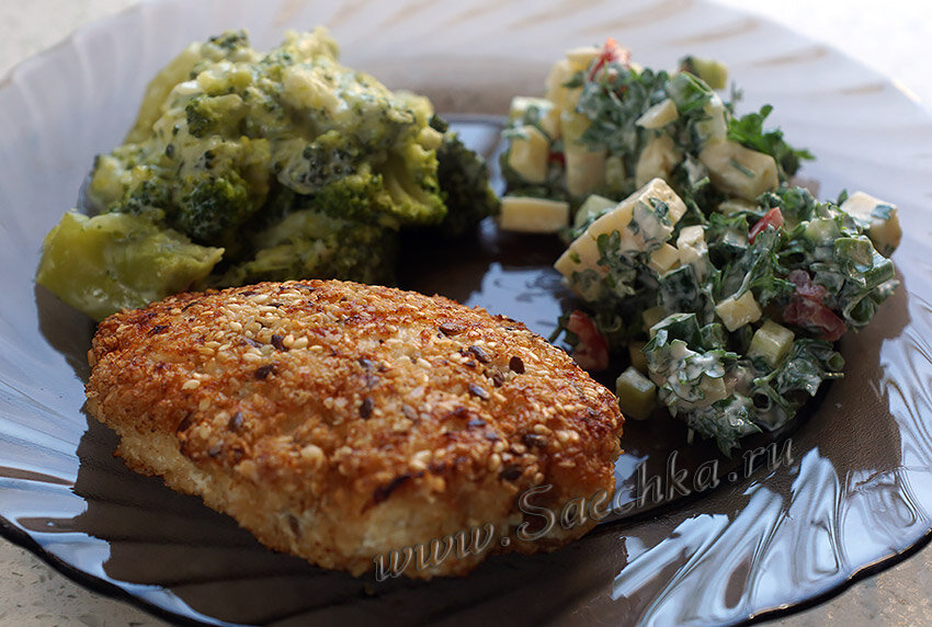 Рубленые котлеты из куриной грудки получаются сочными за счёт одного ингредиента, который мне посоветовали добавлять в фарш. И это не майонез, а гораздо полезнее! А ещё у котлеток очень вкусная и не вредная панировка без муки. Ингредиенты: Рубленый фарш: Панировка: Как приготовить: Брокколи в сырном соусе: Овощной салат с сыром: Полезный совет - Тушёные куриные сердечки :