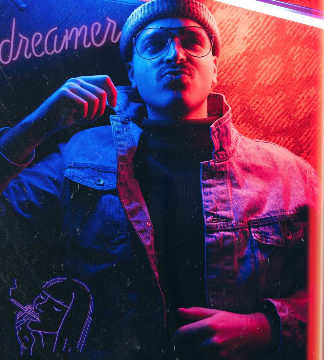 Захотелось поиграть со светом, нашли в магазине на самой нижней полке две последние лампы в старых зашарпанных коробках. По 99₽ за штуку. Была синяя и красная. Подключили их дома в розетки, напялили прикольный шмот. Посмотрите, что получилось. P.s. Неоновые рисунки наложены на телефоне в приложении PicsArt