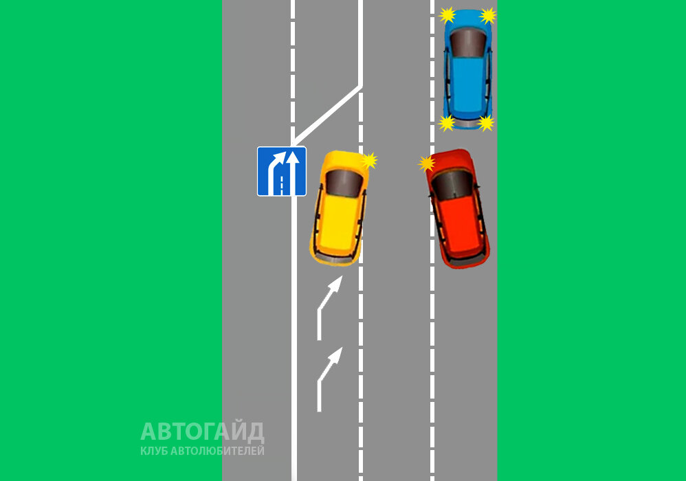 И вот красная машина включает левый поворотник и собирается объехать синее авто. Однако этот же момент водитель желтой машины включает правый поворотник и тоже собирается перестроиться, потому что левая полоса банально заканчивается. Если ТС продолжат движение, то их траектории пересекутся.