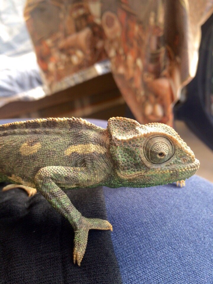 К маме в сад периодически приходят хамелеоны. Мама хамелеонов не жалует. Называет их "Хемингуэями" (яркий пример формирования сакральной табуированной лексики) и в саду их видеть не желает. Хамелеон - животное осторожное, естественно, напугался больше мамы.