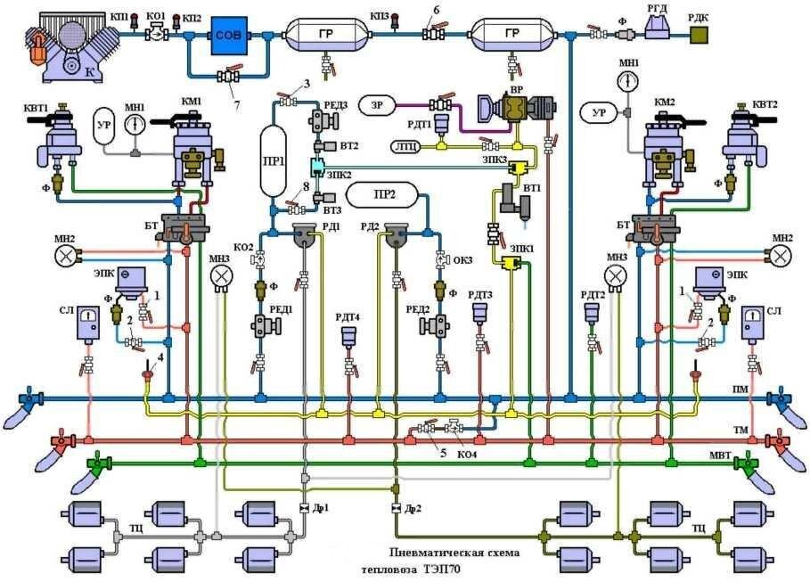 Из ПМ сжатый воздух поступает к приборам и устройствам, расположенным в обеих кабинах управления: через устройство блокировки тормозов (БТ) № 367 к кранам вспомогательного локомотивного тормоза (КВТ1, КВТ2) № 254 и к поездным кранам машиниста (КМ1, КМ2) № 395, а через разобщительные краны 2 к электропневматическим клапанам автостопа (ЭПК) № 150. Через кран машиниста происходит зарядка уравнительного резервуара (УР) объемом 20 л. Из питательной магистрали через редукторы давления (РЕД1, РЕД2) № 348, фильтры (Ф) № Э-114 и обратные клапаны (КО2, КО3) № Э-175 происходит зарядка соответствующих питательных резервуаров (ПР1, ПР2) объемом по кгс/см2, 78 л каждый. Редукторы РЕД1 и РЕД2 отрегулированы на давление 6,0 кгс/см2. Теми же путями сжатый воздух подходит к реле давления (РД1, РД2) № 404. Одновременно с зарядкой резервуара ПР1 сжатый воздух под давлением 6,0 кгс/см2 через разобщительный кран 8 подходит к электропневматическому клапану (ВТЗ) типа КП-53. Из ПР1 через разобщительный кран 3 и редуктор давления (РЕДЗ) № 348 воздух подходит к электропневматическому клапану (ВТ2) типа КП-53, РЕДЗ понижает давление воздуха с 6,0 кгс/см2 до 2,0 кгс/см2.