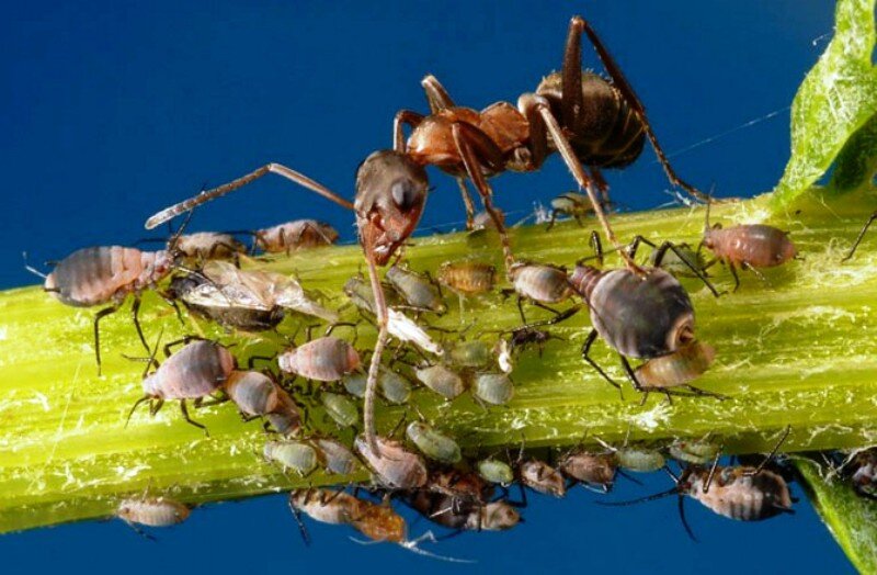 Земляные муравьи, разносчики тлей по деревьям, кустарникам и способствуют развитию тлей, что очень беспокоит.