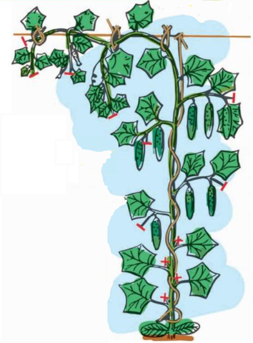 Мой опыт показывает: формировать огурцы нужно обязательно — урожай будет больше. Выращивать дремучие джунгли с редко проглядывающими зеленцами я не хочу. Формирую не всегда по изложенным в садовых книжках схемам, но урожаи из года в год получаю стабильно хорошие. Оговорюсь сразу, сорта я не выращиваю. С ними гораздо хлопотнее, чем с гибридами, урожай ниже, болезней больше, а в неурожайные и холодные сезоны можно и без огурцов остаться. Но это мое личное мнение. Есть много огородников. у которых сортовые огурчики дают приличные урожаи, да и бытует мнение, что они вкуснее. Нижние пасынки и завязи Плети я подвязываю. Обязательно выщипываю в пазухах первых 4—6 листьев все пасынки и завязи (см. рисунок). По-научному это называется ослеплением. Плюсы наглядны: Боковые побеги Далее я прищипываю боковые побеги, оставляя один плод и один лист, выше прищипываю на два плода и на два листа, затем на три плода и три листочка. А там уже плеть отрастает до верхней шпалеры, перекидывается через нее, н