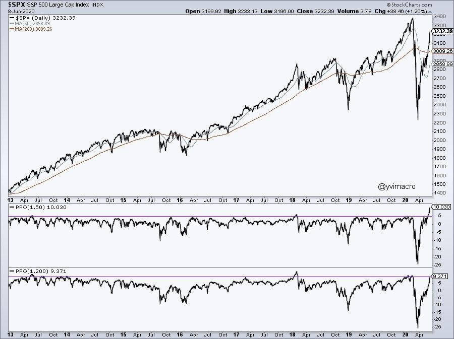 Отрыв SP500 от своей 50-дневной скользящей средней находится на критических значениях, при этом отрыв от 200-дневной MA также на максимуме.