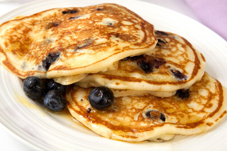 Ингредиенты: Приготовление: 1. Выложить все ингредиенты, кроме ягод, в блендер, смешать до однородного состояния. 2. На разогретую сковороду вылить порцию теста для одного блина. Добавить ягоды. Обжарить до золотистой корочки в течение 2–3 минут, перевернуть и довести блинчик до готовности. Приготовить таким же способом остальные блины