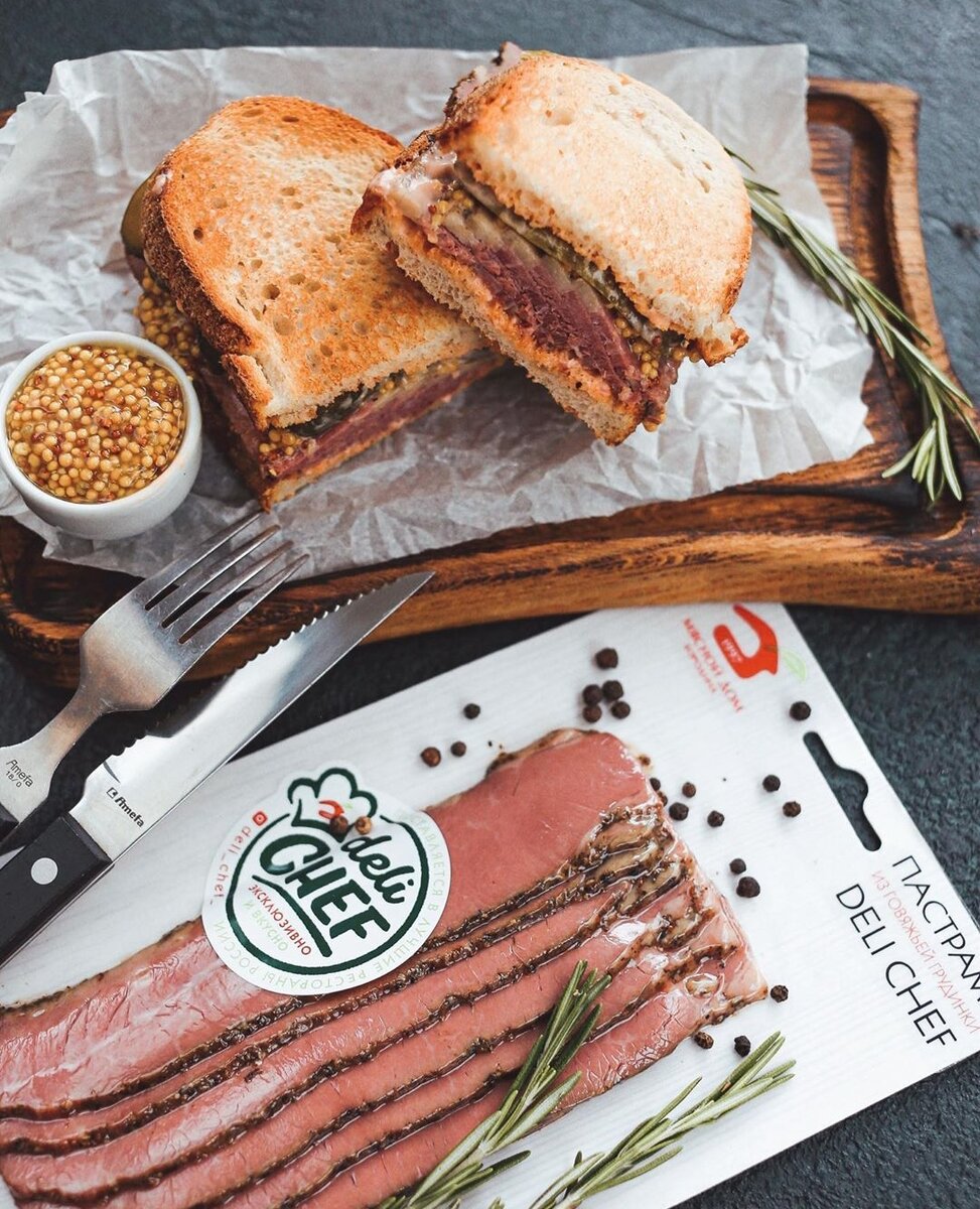 Пастрами — это мясной деликатес, сэндвичи из которого особенно знамениты в Нью-Йорке, их популярность пришла к нам именно оттуда. Готовить её (да-да, Пастрами — это она!) самим достаточно долго, именно поэтому я, для более быстрого приготовления своего сэндвича беру пастрами бренда Готовим сэндвич: Берём два больших ломтика хлеба (берите тот, что любите больше всего), подсушиваем в тостере или на сухой сковороде. Для соуса смешиваем в равных (по 20гр.) частях кетчуп, майонез и хрен. Смазываем соусом ломтики хлеба, сверху выкладываем пастрами (на большой сэндвич я использовал 150гр.), далее — добавляем несколько ложек зернистой горчицы, маринованные огурчики, и закрываем сэндвич! Выходит супер быстро и вкусно, как в ресторане! Кстати, Мясной Дом Бородина поставляют свою продукцию в топовые рестораны Москвы, именно поэтому так похож вкус. У них действительно очень классная продукция, и, что важно, делается из экологически чистого сырья 👍🏻