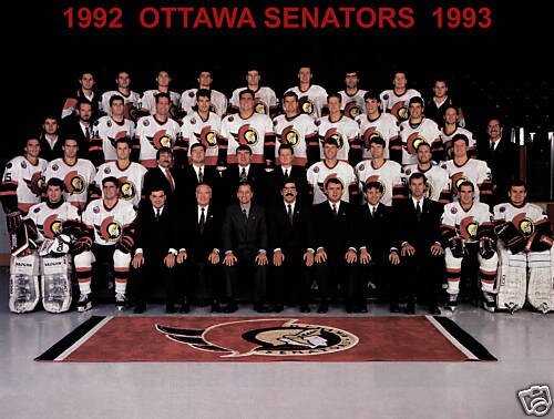 Всем любителям хоккея привет! В новом выпуске , мы посмотрим на ретро фото команды, история которой началась еще в 1883 году. Эта команда выигрывала 7 Кубков Стэнли, еще до того, как была основана НХЛ, а после основания было выиграно еще 4 Кубка. Потом, в 1934 году, история этого клуба прервалась, аж на 58 лет. Эта команда, словно феникс из пепла возродилась в 1992. Давайте вспомним истоки и недавнее прошлое команды Оттава Сенаторз! Состав первого сезона для «новых» Сенаторз сезона 1992/93. В том сезоне состав клубов НХЛ, кроме Оттавы пополнил клуб из Тампы-Бэй. Вернемся к истокам. Команда Оттава Сенаторз с Кубком Стэнли, 1905 год. На этом фотоснимке запечатлен Фрэнк Финниган- легенда «первых» Сенаторз, двукратный обладатель Кубка Стэнли. Играл за Оттаву с 1921 по 1931 год и после сезона в Мейпл Лифс вернулся в родную команду, отыграв за них до 1934 года. Его номер 8 увековечен командой. Фото как раз с церемонии выведения номера из обращения, которое произошло 23 мая 1991 год. Пер