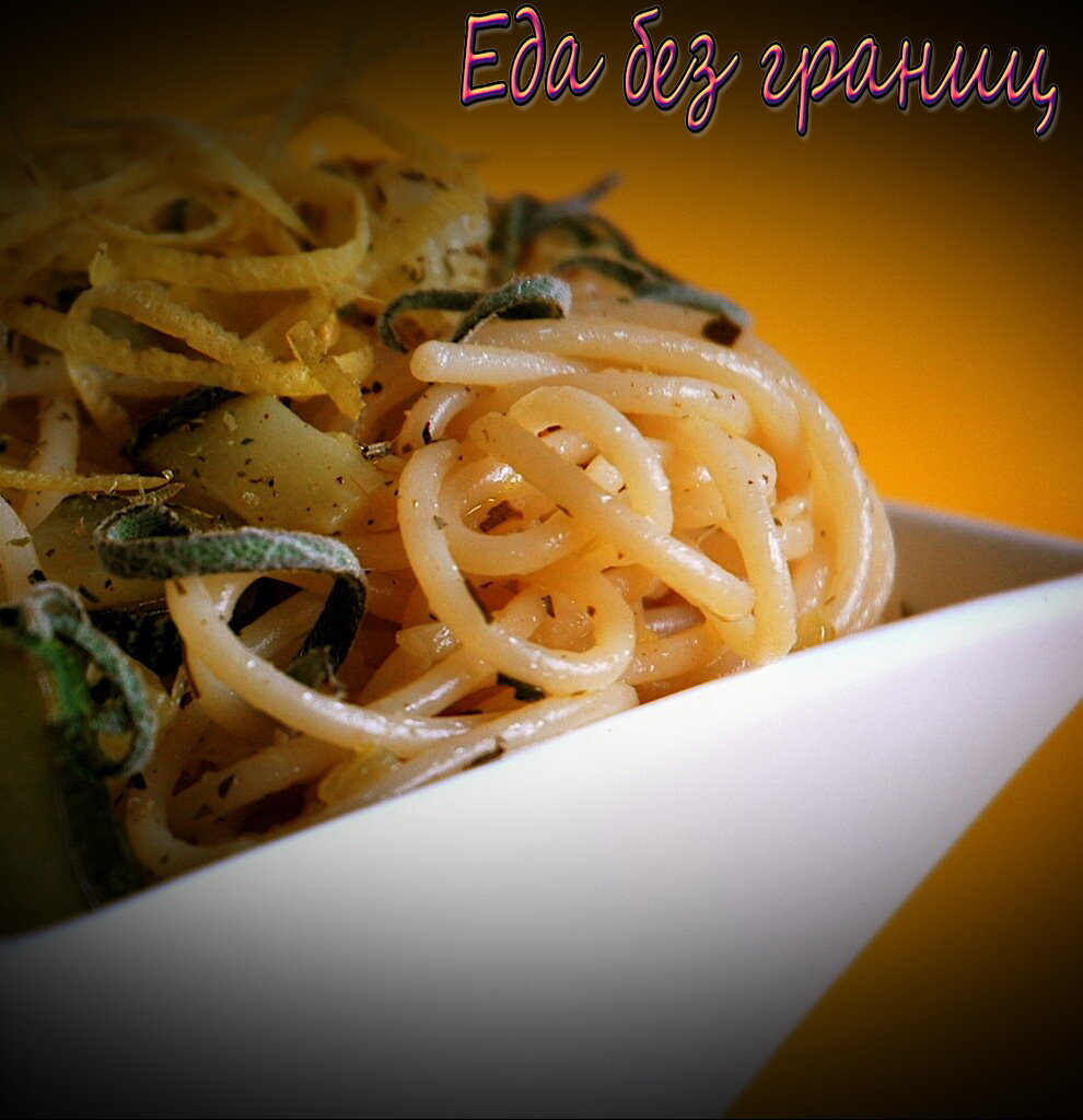 Ингредиенты: 1 лимон - сок и цедра (часть цедры должна быть мелко нарезана для украшения) 500 г спагетти 1 цуккини - нарезанный кубиками 1 лук - мелко нарезанный 1 зубчик чеснока - мелко нарезанный 4-5 столовых ложек - оливкового масла первого отжима соль свежемолотый черный перец горсть листьев шалфея Приготовление: Вскипятите большую кастрюлю с соленой водой и приготовьте спагетти. Если вы используете свежую пасту, это займет пару минут. Если нет, то это займет около 8-10 минут. А пока нагрейте немного масла в большой кастрюле. Обжарьте лук и чеснок осторожно, пока он не станет слегка карамельным. Добавьте нарезанный кубиками цуккини и жарьте еще несколько минут. Соль и перец по вкусу. Нарежьте мелко шалфей и добавьте его к цуккини. Залейте лимонным соком и добавьте нарезанную цедру. Снимите с огня. Смешайте спагетти с лимонной смесью цуккини. Разместите на отдельных тарелках. Налейте несколько капель оставшегося оливкового масла и посыпьте сверху оставшуюся цедру лимоном и шалфе