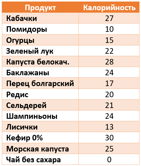 В этой таблице будут показаны все колорильные продукты питания. Очень полезно знать.