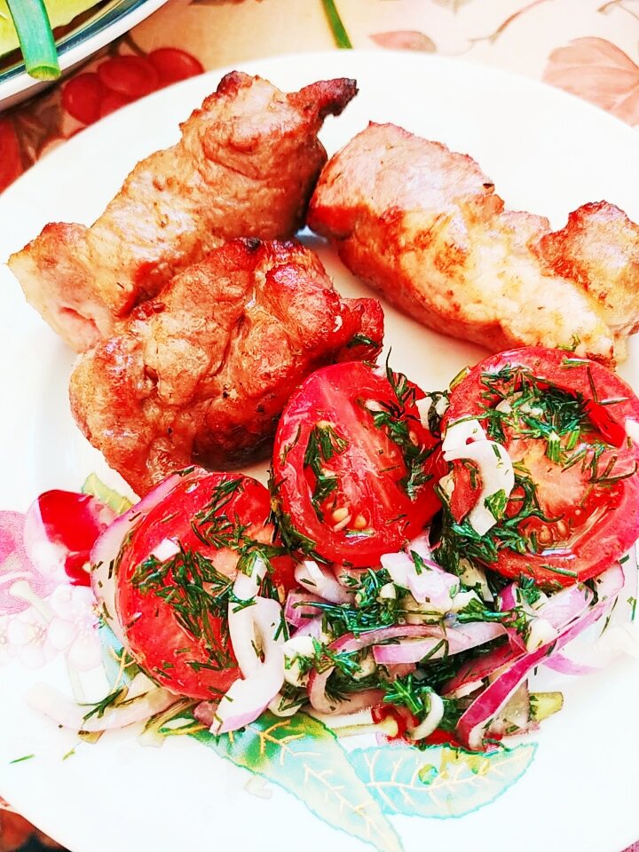 Сегодня захотелось приготовить немного шашлыка (поужинать так сказать). Решили сделать не как обычно, а попробовать новые специи в маринад И так: -1,5 кг - свиной шеи - 800 грамм - репчатого лука - 1 ст.л. копченой паприки - 0,5 ст.л. зиры - соль, перец (по вкусу) Приготовление: Свинину моем, режем на куски 4*4 см(примерно).Репчатый лук чистим, режем полукольцами, складываем в емкость для маринованования, Зиру перетираем в ступке, добавляем ее к мясу, туда же 1 ст.л. копченой паприки,солим и перчим Все тщательно перемешиваем, закрываем крышкой или затягиваем пленкой, оставляем мариноваться часов на 6 По прошествии времени разжигаем мангал, нанизываем наш шашлык на шампура, ждем когда разогретые угли подернуться пеплом и ставим на мангал мясо. Жарим до готовности, поворачивая шампура Приятного аппетита! #Шашлык#Свинаяшея#ProЕстьиProПить #Вкусноипросто