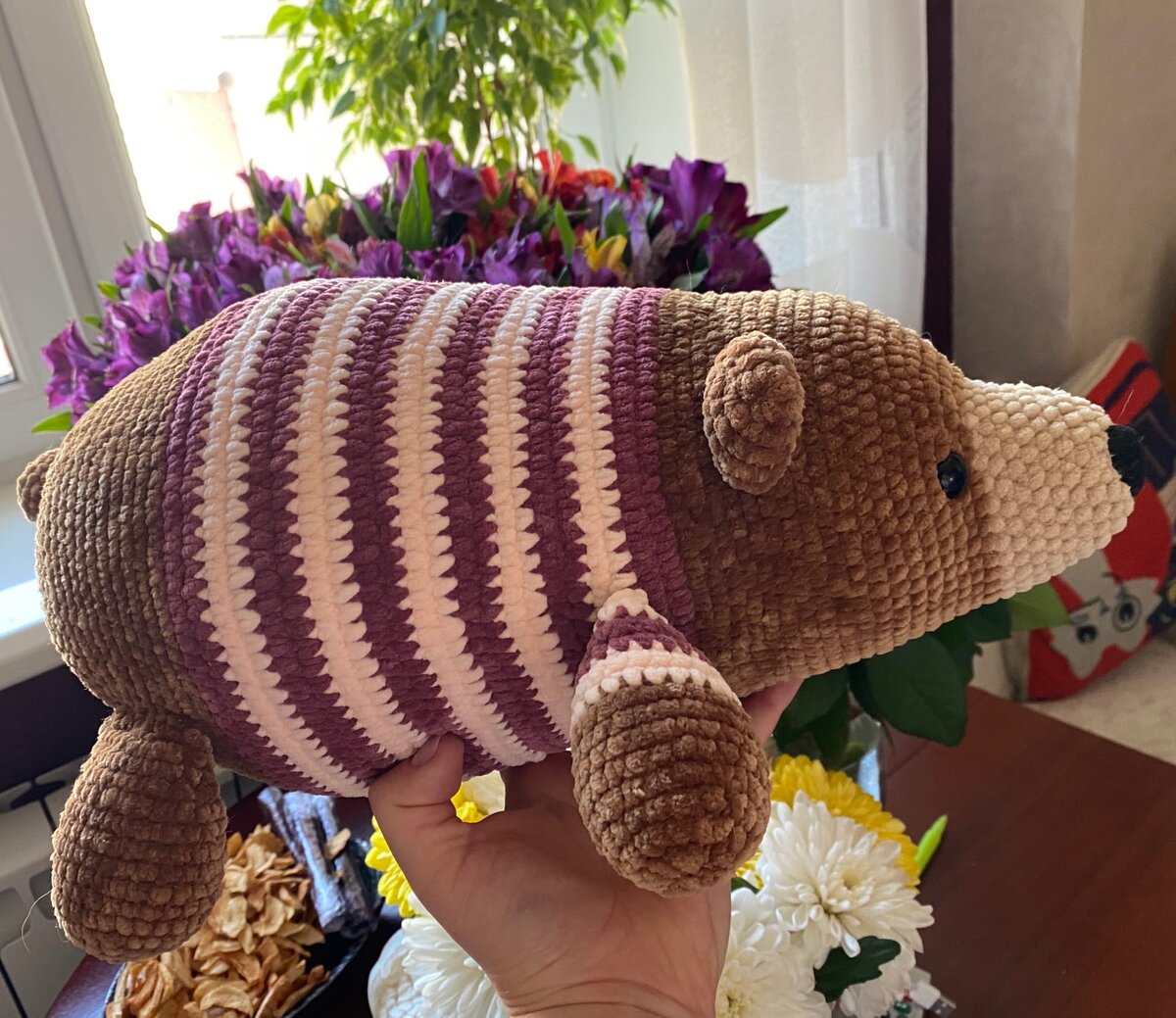 Пряжа подходящих цветов (у меня бежевая, коричневая, молочная, розовая), крючок подходящего размера (у меня 2,10), холофайбер, пластиковые глазки (у меня с внутренней шайбой, можно использовать бусины, полубусины или вышить), нос можно вышить или использовать пластиковый с шайбой.