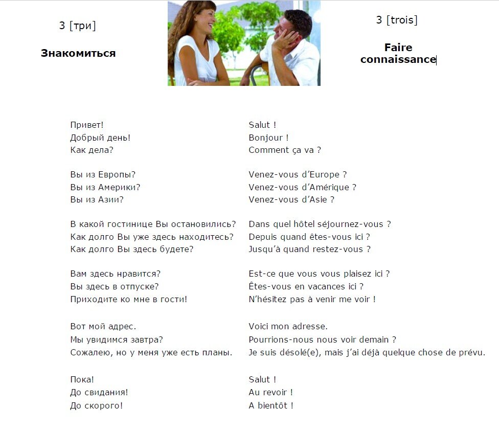 Французский язык. Урок 1. Французский язык. Урок 2. Добрый день! Продолжим изучение французского языка. Французский язык. Урок 3. 3 (три) - 3 (trois) Знакомиться - Faire connaissance Привет! - Salut! Добрый день! - Bonjour! Как дела? - Comment ça va? Вы из Европы? - Venez-vous d’Europe? Вы из Америки? - Venez-vous d’Amérique? Вы из Азии? - Venez-vous d’Asie? В какой гостинице Вы остановились? - Dans quel hôtel séjournez-vous? Как долго Вы уже здесь находитесь? - Depuis quand êtes-vous ici? Как долго Вы здесь будете? - Jusqu’à quand restez-vous? Вам здесь нравится? - Est-ce que vous vous plaisez ici? Вы здесь в отпуске? - Êtes-vous en vacances ici? Приходите ко мне в гости! - N’hésitez pas à venir me voir! Вот мой адрес. - Voici mon adresse. Мы увидимся завтра? - Pourrions-nous nous voir demain? Сожалею, но у меня уже есть планы. - Je suis désolé(e), mais j’ai déjà quelque chose de prévu. Пока! - Salut! До свидания! - Au revoir! До скорого! - A bientôt! Видео для тренировки произношения