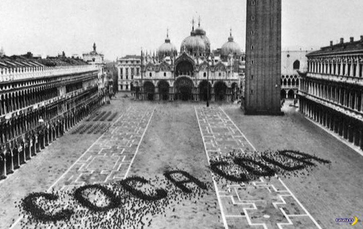 Это фото сделано на площади Сан-Марко в Венеции в 1960 году. Вроде бы ничего странного – название бренда. Однако есть нюанс. Потому что название это из голубей. Компания бренда рассыпала хлебные крошки в форме названия напитка . Маркетинг уровня 1960 года. Голубей там очень много, они реально напасть, загадили всё, что можно. Но их подкармливают, потому что тогда они были одной из достопримечательностей. И вот кто-то из компании бренда Кока Колы придумал, что можно "написать" кормом надпись, а голуби её тут же оформят собой. Так и вышло, в итоге получилась очень необычная реклама Кока Колы. Источник:https://banana.by/index.php?newsid=275640