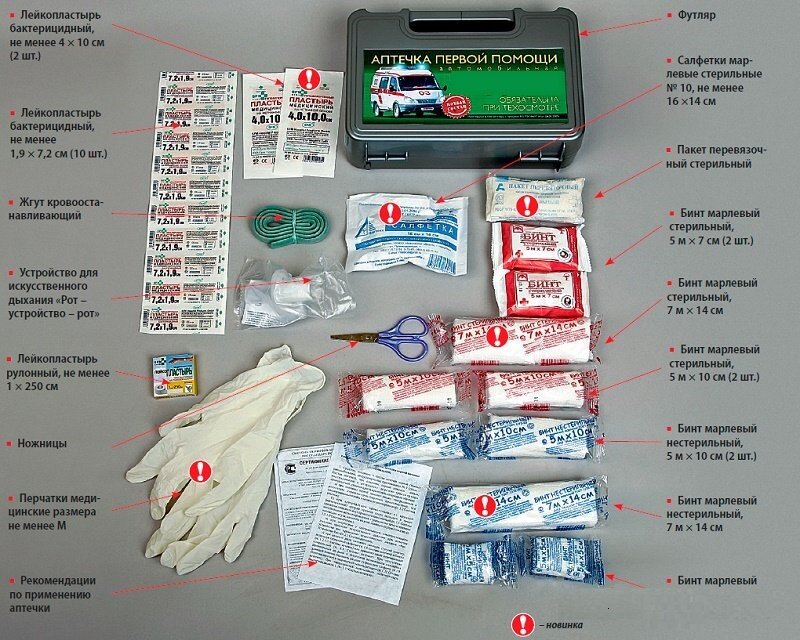 Основное назначение аптечного набора - борьба с последствиями травм, в первую очередь устранение или временная локализация кровопотери. Для этого предназначены различного размера бинты, жгут резиновый кровоостанавливающий, пакет стерильный для перевязки и лейкопластыри. В случае сердечного приступа, часто случающегося после ДТП, предусмотрено реанимационное изделие для производства искусственного дыхания «Рот-Устройство-Рот». Перчатки в составе аптечки предохраняют от занесения инфекции в открытую рану и защищают от заболеваний, передающихся через кровь. Автомобильная аптечка должна содержать: Средства для сердечно-легочной реанимации: Прочие средства: Необходимо также обратить внимание на годность автомобильной аптечки. Благодаря отсутствию в ней лекарственных препаратов, срок автомобильной аптечки - 4.5 года. Это минимально необходимый состав аптечки. Водители могут дополнять его теми препаратами, которые считают необходимыми, например, обезболивающими или обеззараживающими.