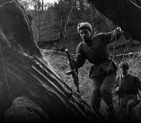 Геня продвигался впереди, внимательно прислушивался к кустам. Евгений в стороне изучал все деревья. Чуткое и настороженное ухо Евгения услышало шорох... Пышная крона кедра шевельнулась... Выдвинулось дуло винтовки и медленно стало поворачиваться на Геню. Евгений пал на колено и открыл огонь. Геня всему только удивился. С дерева выпала винтовка с оптикой. Потом упало тело снайпера...