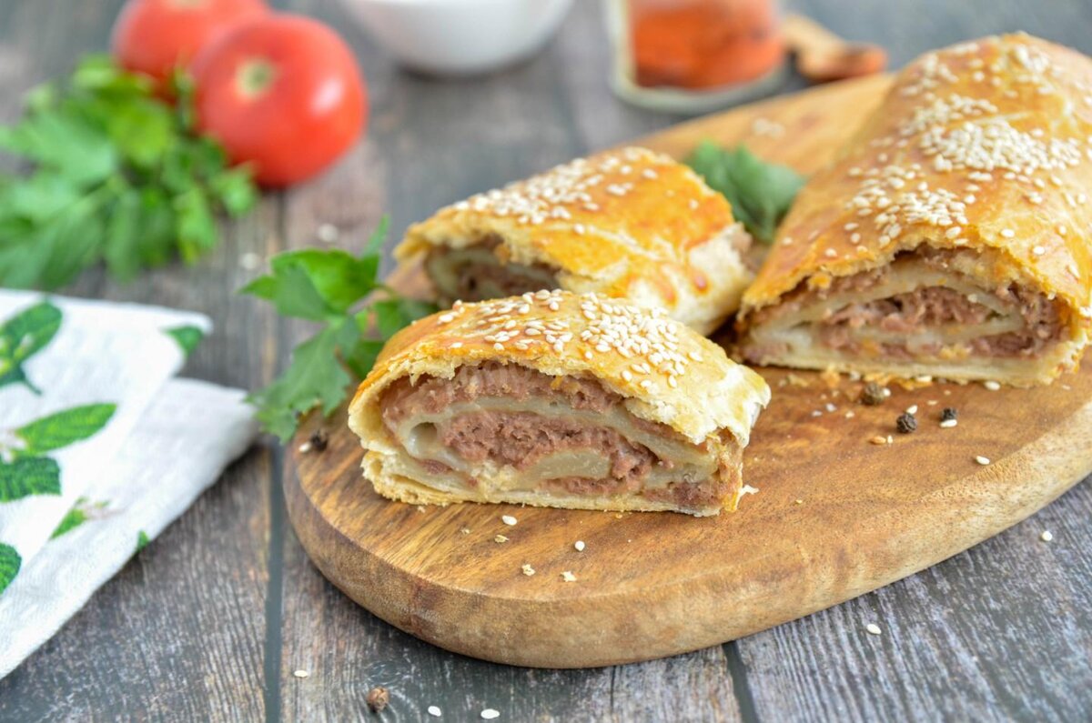 Этот рецепт не хлопотный и быстрый, если, конечно, использовать готовое слоеное тесто. Но, если есть желание и время, приготовьте тесто самостоятельно. Ссылку на рецепт вы найдете в «полезных советах». Выпечка довольно сытная и идеально подходит на обед, ужин или перекус. Не лишним будет упомянуть, что ваши близкие будут в восторге, ведь это так вкусно!