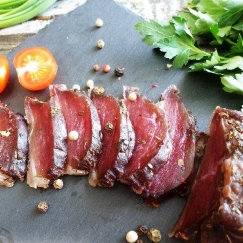 Ингредиенты «Вяленая утиная грудка» Как приготовить «Вяленая утиная грудка» 1. Этап Все специи что целые нужно перетереть в ступке и смешать с остальными специями, а так же добавьте соль и сахар. 2. Этап Филе берите со шкуркой, хорошо его промойте и просушите. На коже сделайте не глубокие ромбовидные надрезы. К специям добавьте коньяк и натрите мясо со всех сторон специями. Мясо поместите в контейнер с крышкой и поставьте в холодильник на 8 часов. 3. Этап Мясо достаньте из контейнера и промокните бумажным полотенцем чтобы убрать всю влагу. Заверните в марлю в несколько слоев и вяльте в холодильнику подвесив на двери или же в хорошо проветриваемом помещении минимум на 10 дней, после смотрите по вашему предпочтению. 4. Этап Приятного аппетита!!!