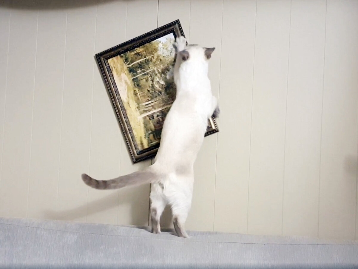 При этом он не просто ходит и "ноет", явно считая меня виноватой в том, что не может взобраться на этот шкаф, Митя начинает откровенно вредничать 😁