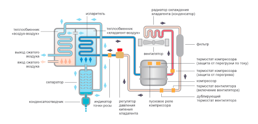 Общеизвестно, что воздушные промышленные компрессоры и сходные с ними приспособления быстро выходят из строя, если сжатый воздух содержит влагу или абразивные частицы. Чтобы этого не допустить, применяются осушители, которые совместно с фильтрационными системами очищают воздух от влаги, масла, примесей ржавчины и пыли. Техника успешно используется в пневмосистемах химической, нефтегазовой, автомобильной, обрабатывающей промышленности, на стеклодувных предприятиях и т. д. Устранение избытка влаги осуществляется посредством конденсации пара на холодной поверхности теплообменника. Большинство рефрижераторных осушителей при стандартных условиях позволяют достичь температуру точки росы в 2–4 °С под давлением. Разновидности рефрижераторных осушителей Циклические. Теплообменник в осушителе такого типа помещен в сосуд с жидкостью либо другим веществом, характеризующимся хорошей теплопроводностью и теплоемкостью. При снижении нагрузки данная емкость не нагревается, поэтому охлаждающий компрес