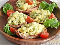 Примерно 3 ст. ложки натертого сыра отложить, остальной сыр добавить в общую массу. Заправить сметаной, перемешать. Противень застелить фольгой и выложить ломтики багета. Яичный салат с черемшой выложить на кусочки багета. Посыпать сверху оставшимся тёртым сыром. Поставить противень с бутербродами в духовку, нагретую до 200 градусов, на 5 минут, только чтоб