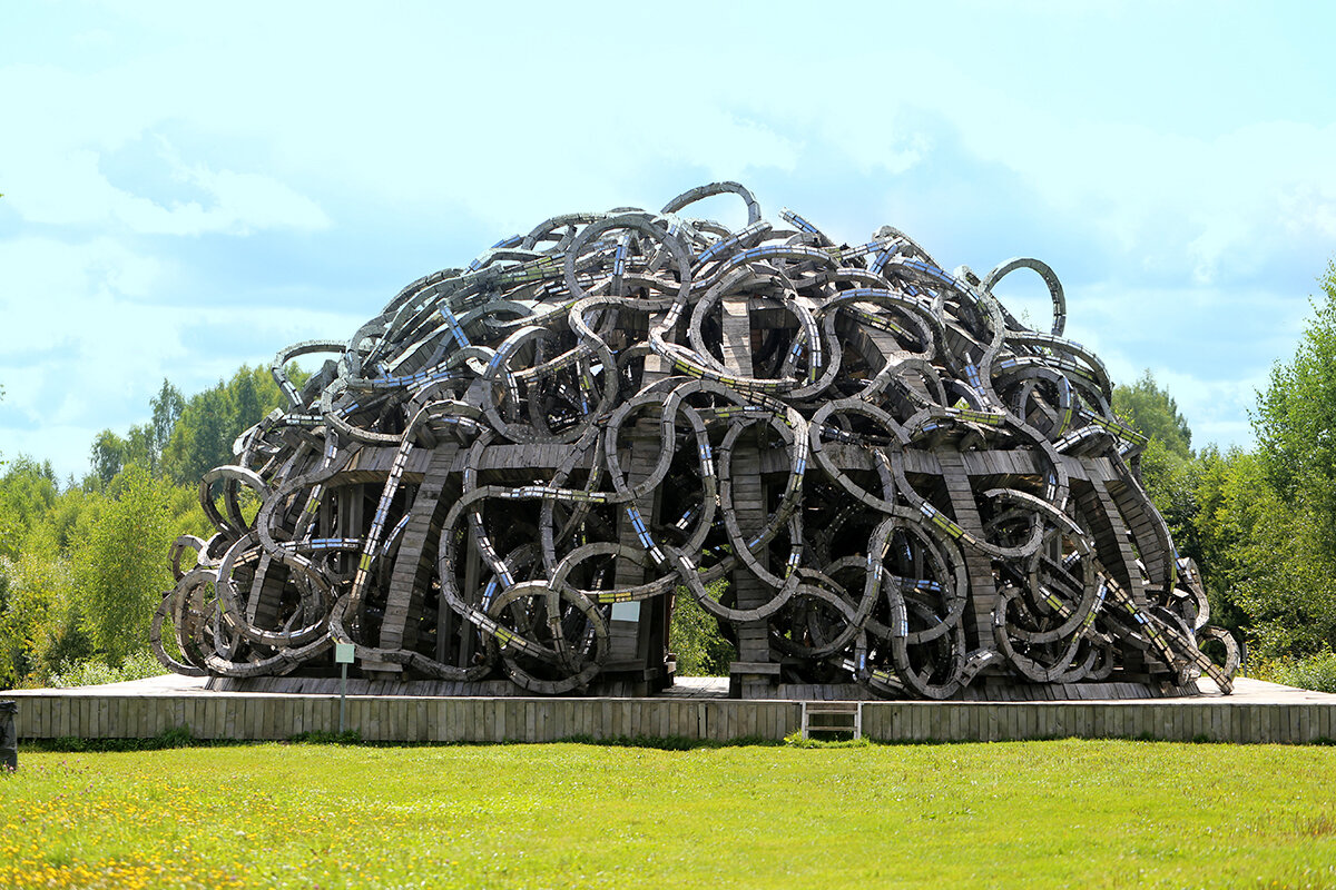 Можно купить скульптуры прекрасного мастера. Я приобрела деревянную сову. Множество скульптур разных животных из дерева. Арт-объект Маяк сделан из веток дерева, можно залезть наверх и посидеть там как в гнезде. Наверху можно посидеть в Николином Ухе или спрятаться в Блиндаж. Далее мы видели Сарай, это космос внутри обычного сарая. Павильон из шишек и Дом над лесом. Это как продолжение природы и в тоже время что-то новое в лесу. Скучно там не будет! Это огромный необыкновенный музей под открытым небом на множестве километрах удивительно красивой земли.