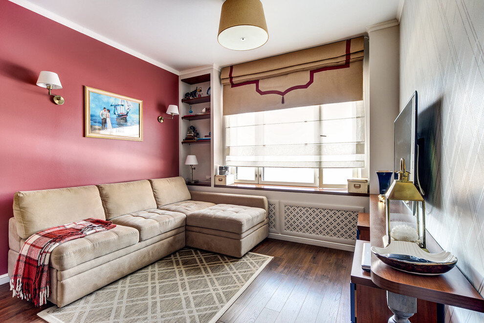 Дизайнер Ольга Захарова оформила евродвушку с отдельной спальней площадью 56 м² для молодой пары. За основу взяли стиль современной классики. Интерьер насытили цветом. Так, кухня-гостиная окрасилась в алый оттенок — цвет любви.