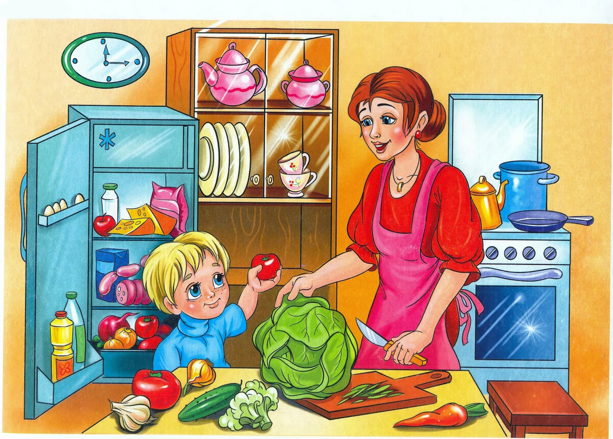 Большую часть времени после рабочего дня мамы проводят на кухне. Это ни для кого не секрет. Приготовить ужин, накормить всю семью, помыть посуду. А что в это время делает ребенок? А что, если не разделять процессы на кухне от процессов игр с ребенком и можно вполне общаться с ним во время домашних хлопот и готовки! Сейчас я Вам расскажу как! Покажите ребенку продукты, из которых вы собираетесь что-то приготовить. Пусть он перечислит их, а потом назовет только те, в которых слышится звук "р" (каррртофель, моррррковка, огурррррцы) или любой другой звук. Если ребенок затрудняется, помогите ему: карррртошка или капуста, аррррбуз или дыня? На вашей кухне наверняка много бытовых приборов. С ними тоже можно поиграть! Как называется прибор, который варит кофе? (кофеварка) Как называется прибор, который режет овощи? (овощерезка) Выжимает сок? (соковыжималка) Еще одна интересная речевая игра "Какой сок? Какой салат?" какой ск получается из яблок? (яблочный), из груш (грушевый), из слив (сливовый
