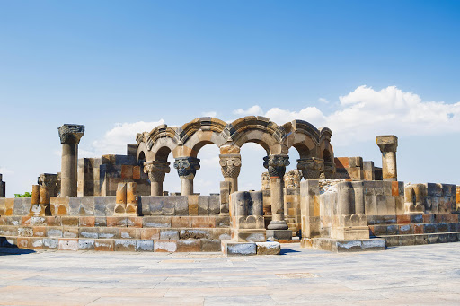 Уникальную ценность представляет находящийся недалеко от Вагаршапата комплекс “Звартноц”, который включает храм Звартноц и расположенную рядом палату католикоса. Этот прекрасный комплекс был построен в 641-661 годах по заказу католикоса всех армян Нерсеса III Шинога, который благодаря своей строительной деятельности получил псевдоним “Шинарар”(Строитель). “Звартноц” был основан на пути, по которому царь Трдат III встречал посещающего Вагаршапат Григория Просветителя, и, предполагается, что Нерсес III построил храм имени св. Григория, чтобы увековечить эту встречу. Именно здесь хранится часть мощей последнего. Однако, комплекс более известен под названием “Звартноц”, поскольку он посвящён небесным радостям: радостям ангелов. Итак, “Звартноц” означает также “Собрание ангелов” (букв. пер.). “Звартноц” действовал до конца X века. В начале XX века разрушенный “Звартноц” находился под толстым слоем земли. Согласно раскопанным материалам, до возведения храма здесь находились древние постройк
