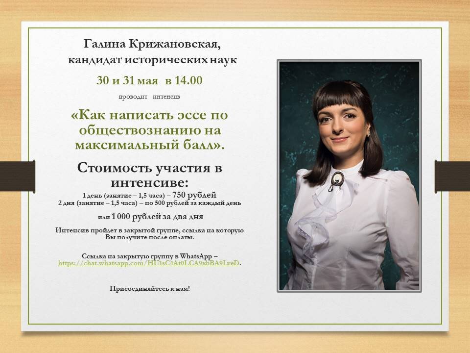 Опытнейший тьютор по подготовке к сдаче обществознания (в частности, эссе) к. и. н. Галина Крижановская - в Брянске и Питере ее многие знают - проводит 30 и 31 мая в 14.00 онлайн-интенсив (вебинар) «Как написать эссе по обществознанию на максимальный балл». Стоимость участия в интенсиве: 1 день (занятие – 1,5 часа) – 750 рублей 2 дня (занятие – 1,5 часа) – по 500 рублей за каждый день или 1 000 рублей за два дня Интенсив пройдет в закрытой группе, ссылка на которую Вы получите после оплаты. Ссылка на закрытую группу в WhatsApp ВОТ ТУТ - ПЕРЕХОДИТЕ Присоединяйтесь! ЭТО НЕ ТЕ ДЕНЬГИ, ЧТОБЫ ПРОВАЛИВАТЬ ЕГЭ...