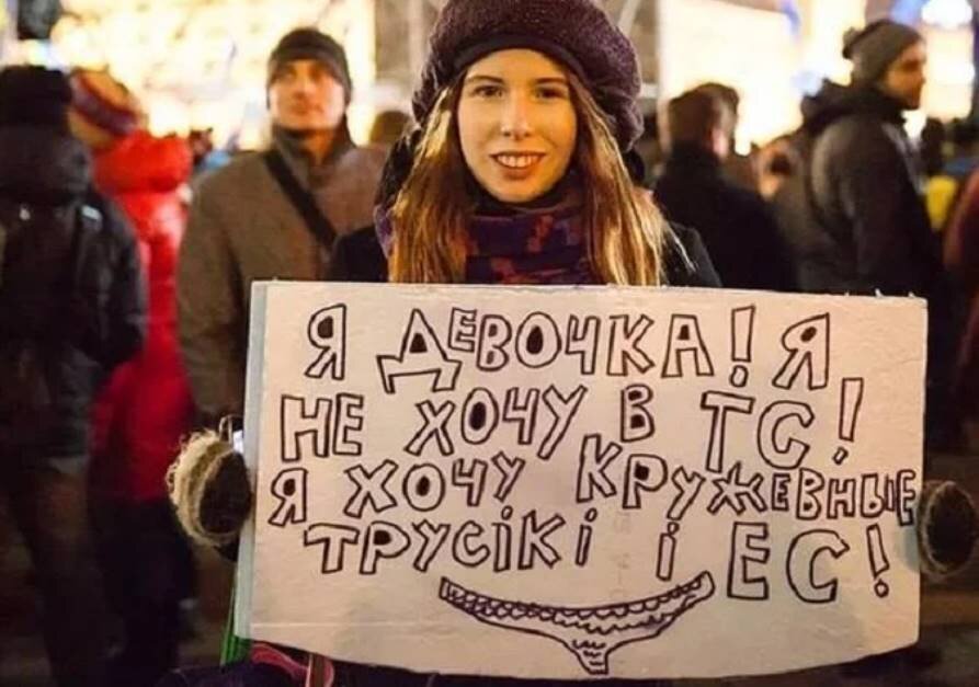 **- всем памятен этот майданутый плакат: «Я девочка! Я не хочу в ТС! Я хочу кружевные трусики и ЕС!» Это и есть верх бандеровской идеологии для простых смертных холопов, которые в принципе не смогут понять все духовное и моральное уродство, тех истинно «свидомых» бандеровцев, которые принесли идолу «украинство понад усе» свою душу и готовы принести на алтарь ему и весь мир, в том числе тысячи, а если необходимо, то и миллионы ни в чем неповинных жизней.