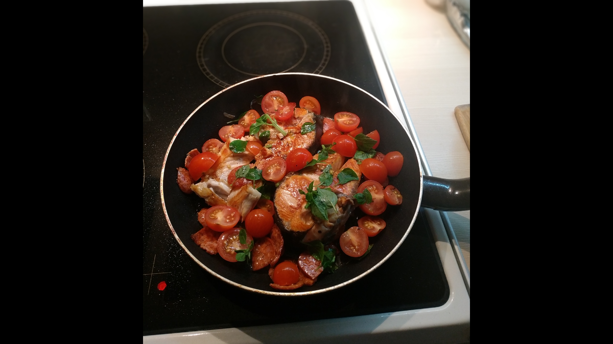 Время приготовления: 11 минут. Количество порций: 2. Количество ингредиентов: 9. Стоимость блюда: Семга: 330 ₽; Черри: 89 ₽; Базилик: 30 ₽; Оливки: 33 ₽; Чоризо: 34 ₽; Итого: 516 ₽. Семга вкусная рыба, как бы вы ее не приготовили. Можно запечь в духовке, пожарить на гриле или сварить уху.Точно будет вкусно. Но если вы уже все попробовали и хотите разнообразить свое меню, попробуйте приготовить рыбу по рецепту Джейми Оливера. Он даже самую вкусную рыбу делает еще вкуснее. И этот рецепт просто бомба, которую хочется готовить снова и снова. Мы готовили дважды и оба раза были просто в восторге! Ингредиенты: Мы делали все на глаз, ничего по граммам не измеряли. Процесс приготовления: - Рыба жарится до готовности, у нас это заняло по 3-4 минуты с каждой стороны. Мы любим жарить на сковороде гриль, но можно взять любую сковороду. Рыбу не нужно ни солить, ни перчить, так как блюдо будет достаточно соленым за счет колбасы и оливок. - Черри и базилик нужно замариновать с винным уксусом, сол