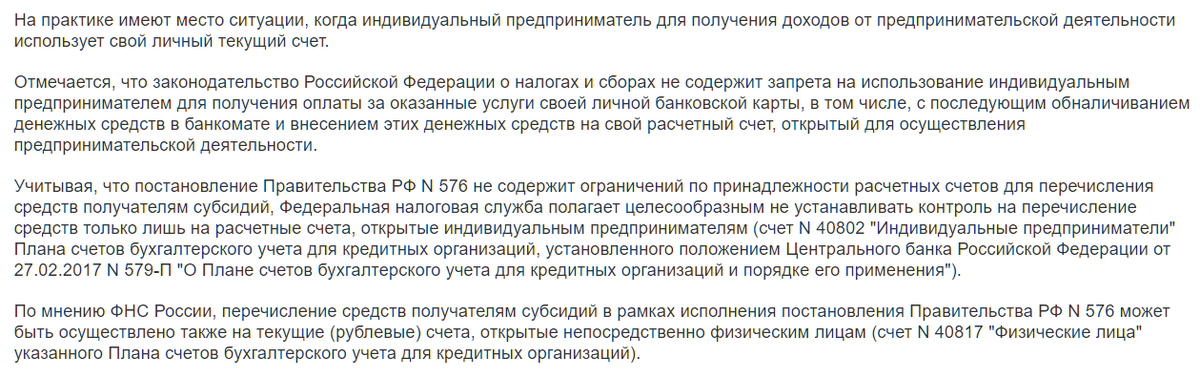 В налоговой объяснили, как получить субсидию предпринимателям, у которых нет расчётного счёта. По закону ИП не обязан открывать расчётный счёт — предприниматель может использовать для бизнеса свой личный счёт в банке. Если это ваш случай, укажите в заявлении на получение субсидии из-за коронавируса номер своего личного счёта. Но это касается только тех, у кого нет расчётного счёта — если он есть, получить деньги на личный счёт не получится. Письмо налоговой от 07.05.2020 года