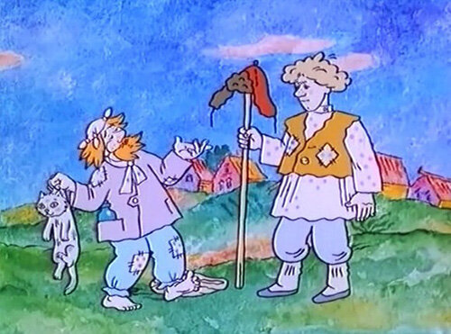 Приехал Мартынка в город, стал ходить по улицам да присматриваться. И попался ему на глаза злой мальчишка: поймал кота, зацепил веревкой за шею и давай тащить на реку.