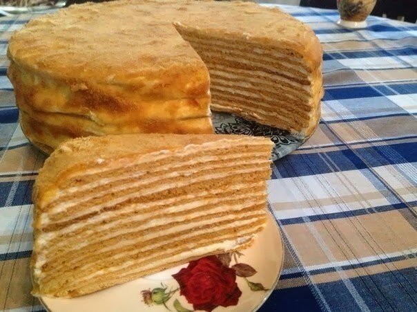 Сливочное масло растопить на водяной бане, добавить сахар, воду и прогреть на бане до растворения сахара. Добавить мёд и снова прогреть, пока мёд растворится. Добавить соду, постоянно мешая, пока сода перестанет шипеть.От себя добавила ст.ложку водки( или коньяка) . Снять с бани и в горячую массу добавить 1-2 стакана муки, размешать , накрыть и оставить остывать до тёплого состояния. Затем по одному ввести яйца и оставшуюся муку. Муку всю сразу не добавляйте, может уйти меньше или больше. Замесить тесто средней консистенции, накрыть и оставить на пол часика.Затем разделите тесто на 10-12 частей, раскатывайте каждую часть сразу на пекарской бумаге. Я раскатывала очень тонко, мой размер коржа 26 см. Всего получилось 12 коржей -11 на торт, 1-на посыпку. Выпекать при темп 200 гр. 5 минут( до золотистого цвета)