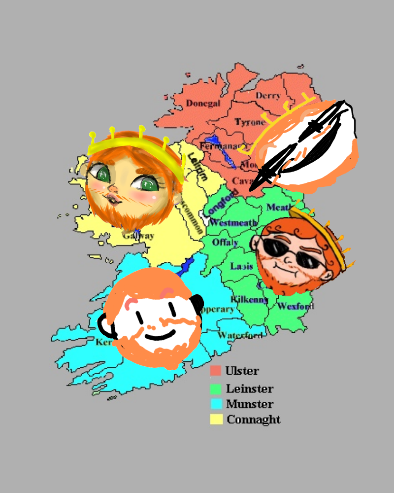 Не единожды я сталкивался с вопросом следующего характера: почему в Ирландии "топовым" цветом является именно зелёный? Казалось бы, интересного ответа на него ждать не стоит, но я покопался и нашёл пару очень интересных ответов вообще по всей колористике Ирландии. Усаживайтесь поудобнее, лепрекон-историк сейчас вам всё расскажет! Для начала объясню базис: Ирландия традиционно делится на 4 провинции — Коннахт (жёлтый на карте ниже), Ольстер/Ульстер (красный), Ленстер (зелёный) и Манстер/Мунстер (голубой). Выделяют ещё иногда Мит/Мид, входящий ныне в Ленстер, и выделялся он прежде потому, что был вотчиной Верховного короля, почти как Владимир на Руси. Все они имели собственные традиции, а ещё каждая пятина имела собственные традиционные цвета. Раз нас интересует прежде всего зелёный цвет, то был он с языческих времён одним из важнейших на острове, и до принятия зелёно-бело-оранжевого флага фактически был главным цветом страны (флагом была золотая лира на зелёном фоне). Причина тому дов