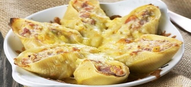 Ракушки отварить, откинуть на дуршлаг и дать чуть остыть, чтобы в руки можно было взять. Ложечкой берём начинку и фаршируем каждую ракушку, "укрывая" тёртым сыром.