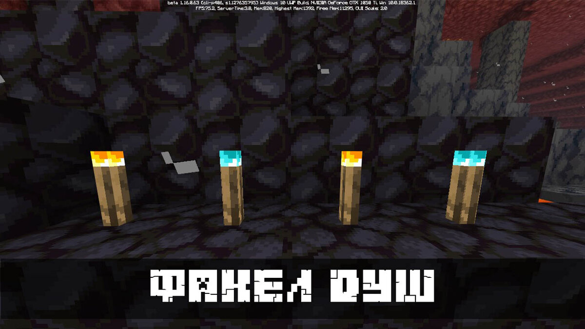 Факел и фонарь новые предметы, они излучают луч света. От имеющихся прототипов с верхнего мира Майнкрафт, фонарь и факел душ отличаются другим тоном пламени. Точно также имеется костер душ, который создается совсем как простой, но взамен угля в центральной части используется песок душ. Чтобы сделать крафт новых предметов, вам нужно создать факел из палки, почвы душ и угля. Фонарь делается если синий факел покрыть слитками из железа. Также мы предположили, каким будет обновление 1.18: https://4mcpe.com/skachat-minecraft-pe/2290-minecraft-pe-1-18-na-android.html