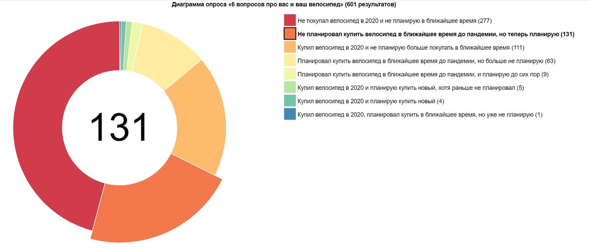 Давайте начнём с новенького. Я написал визуализацию для для последнего вопроса: Купили велосипед в этом году или планируете это сделать в ближайшее время? Поглядеть на «пончик» в интерактиве можно по ссылке. Посмотрим, у кого пандемия внесла коррективы в планы по покупке велосипеда .