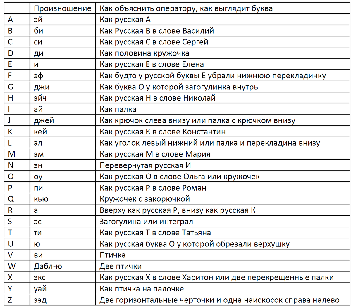 Поэтому здесь я публикую небольшую подсказку, которой можно воспользоваться, чтобы объяснить оператору, какую именно латинскую букву вы имеете ввиду.