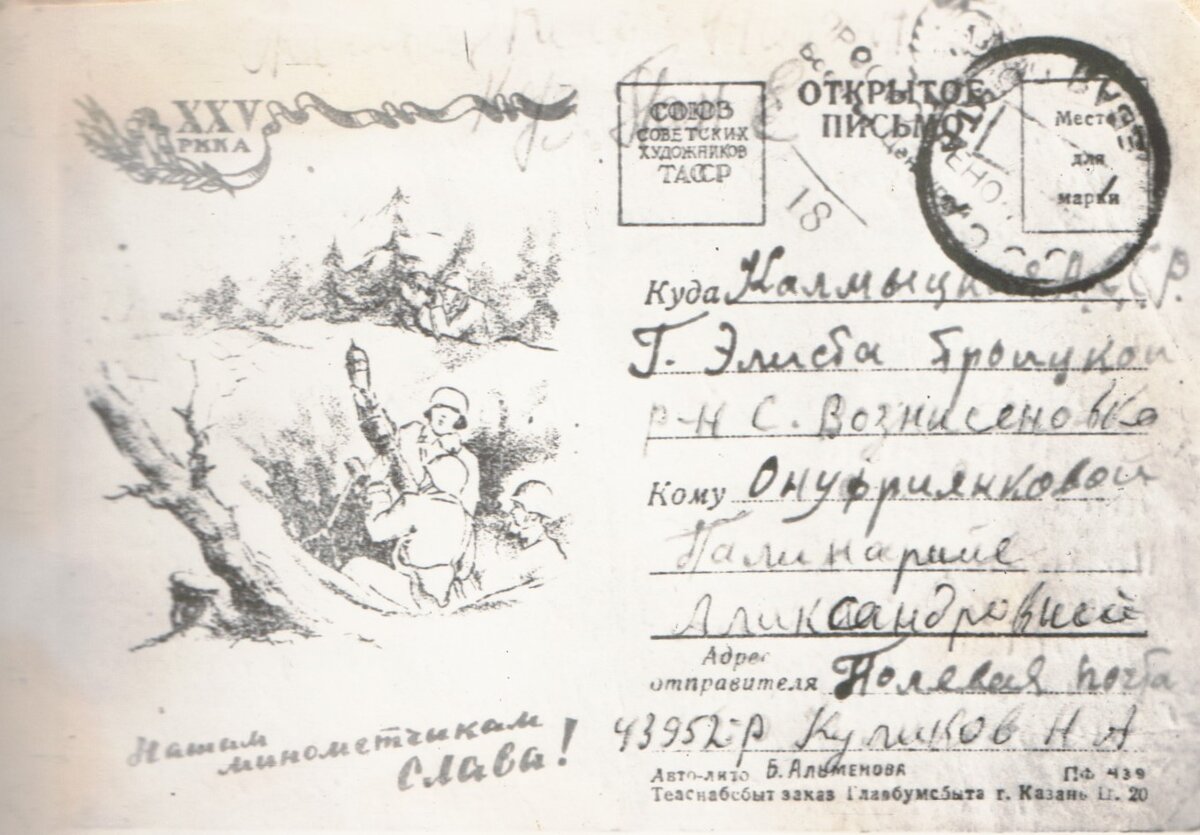 "Пущено письмо от известного твоего брата Коли. Добрый день или вечер дорогая сестрица Полина. Во-первых, строках сообщаю вам низкий привет, а во-вторых, я вам сообщаю, что я жив и здоров, чего и вам желаю быть здоровыми на долгие лета, сестрица Поля. Пропишу тебе, что от вас писем не получаю, но получил два письма от Маруси и Тоси. Узнал от них, что вы живые и решил написать хоть маленькое письмо, а если получу от вас ответ, то напишу больше. Поля, передай привет всем родным и знакомым, мамаше и моему семейству. Поля, если получишь, то опиши все, что было у вас. Пока все, остаюсь жив. С приветом, твой брат Коля. 27/1У-43 г. "