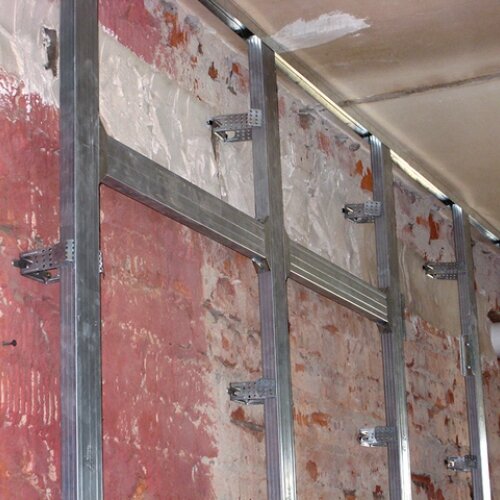 В прошлой статье мы рассмотрели монтаж ГКЛ на деревянную конструкцию . Сегодня поговорим о металлической подсистеме . Начинаем как всегда с разметки . Промеряем вертикаль правилом с уровнем , отбиваем линию на потолке параллельно стене с учётом погрешности стены плюс толщина направляющего профиля , профиль используется ПН 27\28 , затем переносим линию на пол , можно отвесом не хуже лазерного уровня , разве что помощник потребуется . Ещё как вариант , верхний направляющий крепится , отрезаются по размеру два профиля ПП60\27 , которыми будет выставляться стена , нижний направляющий профиль укладывается на пол примерно там где он должен будет находиться по краям вставляются профиля ПП , выставляются по уровню и фиксируется направляющий . Далее будем размечать стоечные профиля . Вдоль нижнего направляющего рулеткой каждые 60 см. ставим метки на полу , потом вставляем профиль по отметке выравниваем по уровню , переносим метку на верхний профиль , на стене очерчиваем профиль в тех