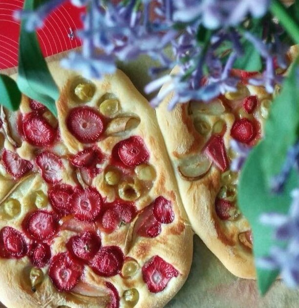 В данный момент участвую в челлендже, который проводит моя сестра - 28днейбезсладкого. Первые дни даются тяжело, ведь участники сладкоежки, которые усердно ищут альтернативу привычным вкусняшкам. В челлендже можно есть хлеб и пиццу, поэтому немного поразмыслив, придумалась сладкая пицца, которая нравится даже детям. Понадобится: *Тёплая вода - 250 мл. *Растительное масло - 4 ст.л. *Сахар - 1 ст.л. без горки *Соль - 1 ч.л. без горки *Дрожжи быстрорастворимые - 7 гр. *Мука *клубника - 15 шт. *виноград - 1 небольшая гроздь *груша - 1 шт. Способ приготовления: Теплую воду налить в ёмкость, добавить туда соль, сахар, растительное масло и дрожжи. Добавить муку, чтобы тесто держало форму, но не было слишком густым. Духовку греем на максимуме. Когда тесто поднимется вдвое - оно готово. Делим тесто на две части, формируем две овальные лепешки. Фрукты тонко режем. Раскладываем на тесто в хаотичном порядке. Выпекать до готовности в зависимости от возможностей Вашей духовки. Есл