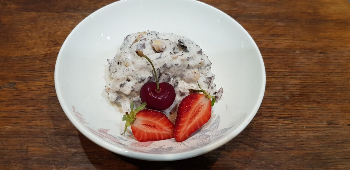 Привет друзья, ко мне неожиданно пришли гости, по мимо основного стола, хотелось бы завершить нашу трапезу десертом. А так как любой десерт надо готовить прилично больше времени чем 10 минут, а покупать готовый не как не хотелось, немного подумав меня осенила идея!!! Почти самодельное мороженное!))))))) Пройдясь по магазину и просмотрев желтые ценники я набрал такой набор на 6 человек! Нам понадобится: Мороженное пломбир - 400гр Шоколад - 2 плитки (200гр) Печенье - 2пачки (150гр) Шоколад я купил с орехами, можно брать простой шоколад, а орехи добавить отдельно! Крошим печенье руками, можно скалкой поломать. Шоколад рубим ножом. Мы приготовили базу!! Эту базу можно корректировать всем что у вас есть дома! И так множество вариантов!) Продолжаем готовку! Достаем мороженное, и даем ему немного подтаять! И перемешиваем все до однородности слегка взбивая наше мороженное!! Раскладываемым по тарелкам, на украшение тоже можно проявить глубокую фантазию! Если есть у вас топинги, то вам крупно