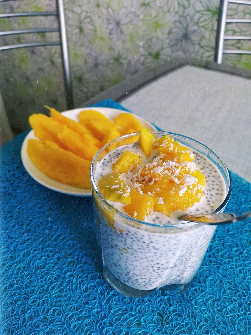 Ингредиенты: 2 ст.л семян чиа 100-150 мл любого растительного молока (рисовое, овсяное и т.д.), кто пьет обычное можно и с обычным Манго, либо любые другие фрукты/ягоды которые вам нравятся. Но честно скажу я больше всего обожаю с манго) Приготовление: Все просто, делать практически не нужно ничего! Наливаете в стакан молоко, добавляете семена чиа, размешиваете, можно накрыть сверху крышкой, после этого отправляете в холодильник (я обычно ставлю на ночь). Чем больше они будут настаиваться, тем больше будут разбухать. С утра достаете режете фрукты/ягоды и добавляете к пудингу, по желанию можно сверху посыпать кокосовой стружкой. Поздравляю, ваш идеальный, полезный и вкусный завтрак готов!