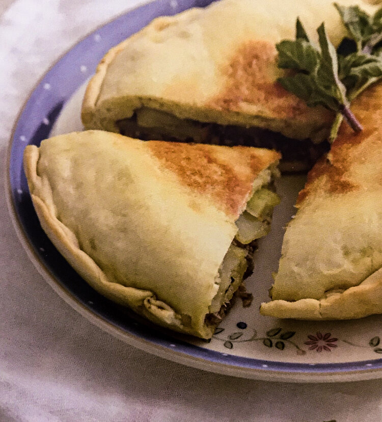 Чашу мультиварки смазать сливочным маслом и выложить первую часть теста, сверху равномерно распределить рыбу, смешанную с зелёным луком и яйцом и затем выложить кружки картофеля. Посыпать солью и специями. Накрыть второй частью теста и защипать края . Сделать несколько проколов вилкой.